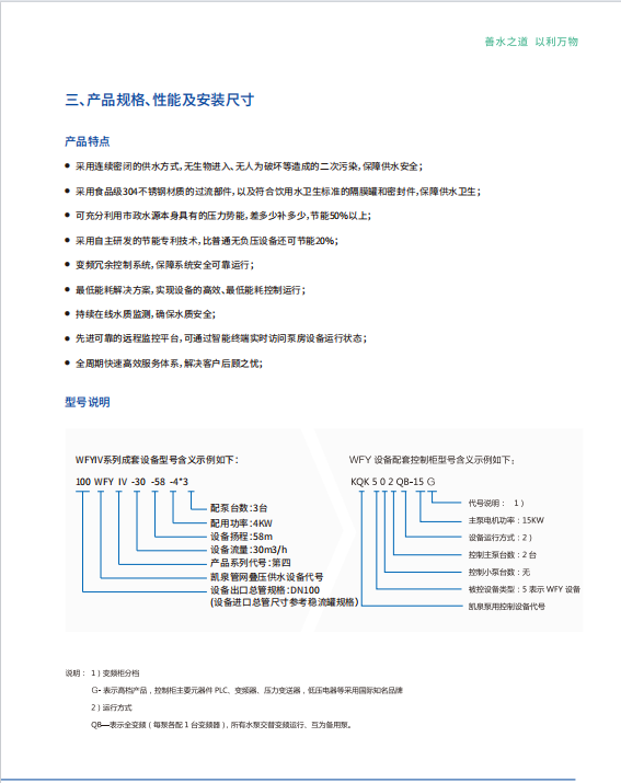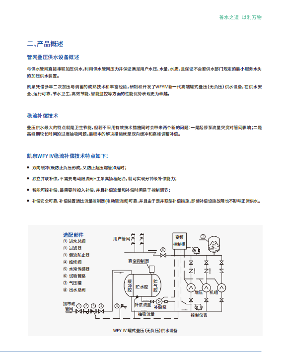 直接連到市政給水官網(wǎng)上,采用穩(wěn)流補(bǔ)償和真空抑制技術(shù),利用市政給水管網(wǎng)壓力直接增壓供水,并對(duì)管網(wǎng)壓力不產(chǎn)生負(fù)壓且能夠穩(wěn)定和調(diào)節(jié)水量的供水設(shè)備,稱為無(wú)負(fù)壓(或疊壓)給水設(shè)備。凱泉WFY-IV新一代高端無(wú)負(fù)壓給水設(shè)備,在供水安全、運(yùn)行可靠、節(jié)水衛(wèi)生、高效節(jié)能、智能監(jiān)控等方面的性能優(yōu)勢(shì)表現(xiàn)更為卓越。